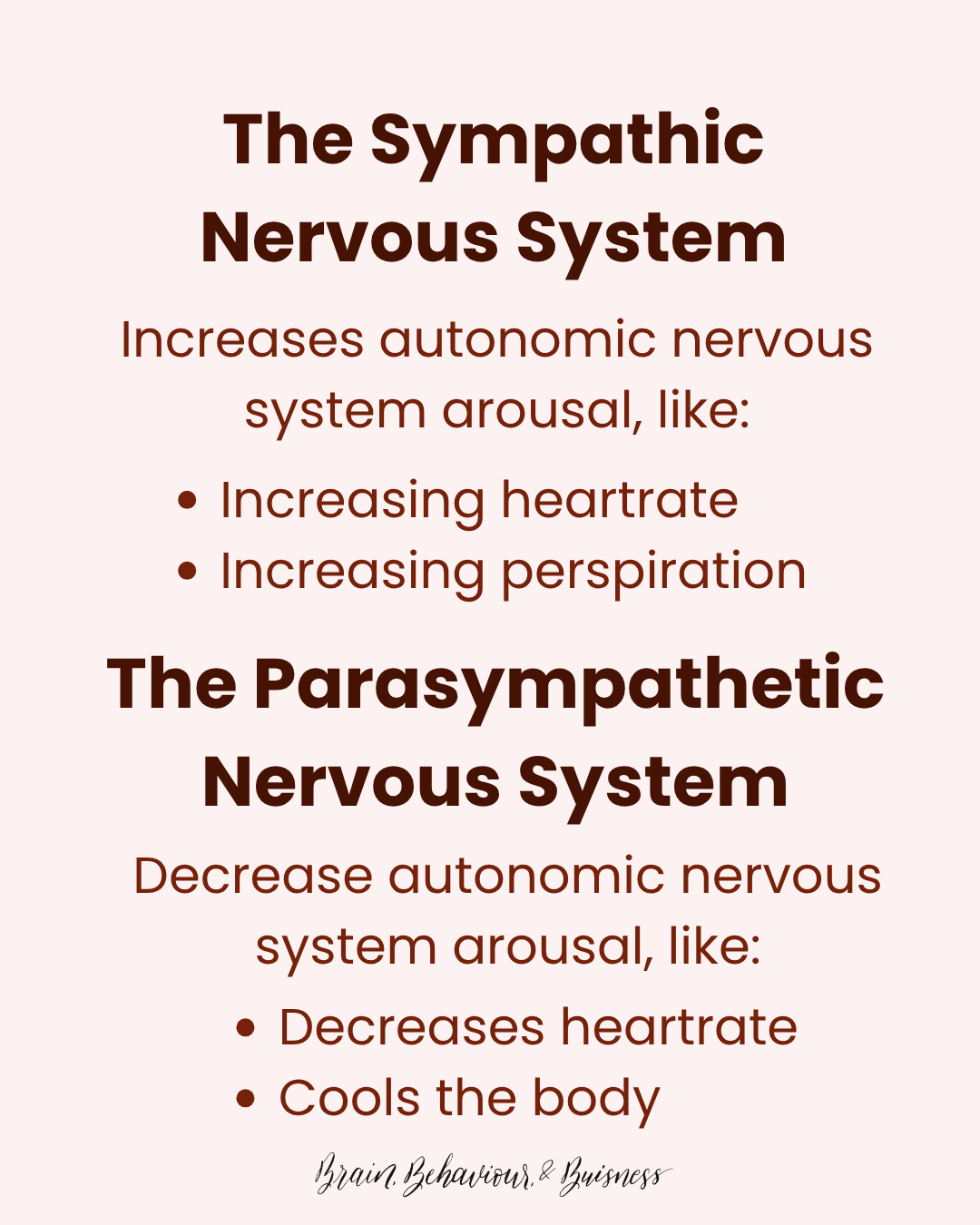 Despite what the term sympathetic might make you thinking, this system if anything but. In fact, it’s the system in this dyad that’s responsible for increasing nervous system arousal. This system includes body changes like increases in heart rate and therefore blood pressure, sweating, blushing, etc. It also is the system responsible for the fight or flight response.