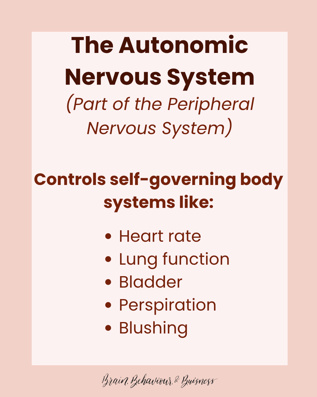The Autonomic Nervous System is responsible for automatic functions in the body. Specifically, the function of blood vessels, heart, bladder, lungs, etc. You might also here that these nerves are part of the self-governing systems of the body. These systems run independently of conscious thought, even if they can be influenced by it.
